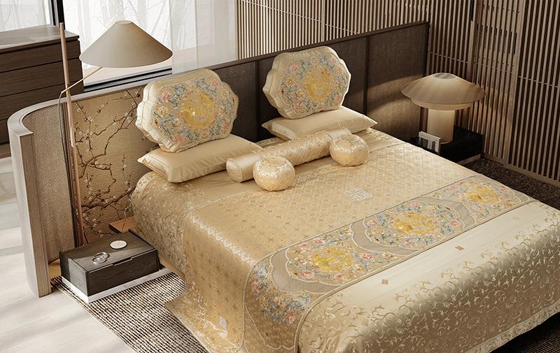 龙凤呈祥的盘金图一共五组,万物归五行,代表了东南西北中五个方位, 也代表了金木水火土五种形态, 更是福禄寿喜财圆满的吉祥之意。整套床品画图历经一年半的时间,仅绣工用时达 10000个小时,一个绣娘创造作品差不多三年半的时间才呈现于此, 可谓是: 煌煌之盛谓之“华”,盛大庄重谓之“鼎”,呈现盛世华丽的端庄典雅,奉上最隆重的祝福和祥瑞。